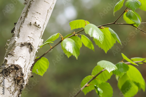 spring background of birch leaves on a blurred green background. birch branches with young leaves in spring