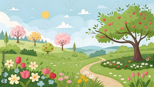 landscape, sky, nature, spring, grass, vector, summer, tree, field, flower, illustration, meadow, cloud, cartoon, sun, green, flower, hill, season, cloud, scene, autumn, land, mountain, rural