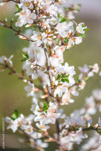 Spring gardening concept; Twig with cherry blossom on the green natural blurred background