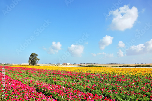 spring, field, ranunculus, israel, plant, flower, yellow, nature, sunlight, meadow, sunbeam, nobody, agriculture, green, colours, beauty, outdoors, rural, horizon, grass, blossom, buttercup, landscape, season
