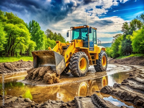 Spring land preparation involves using a yellow construction loader at a muddy work site to efficiently lift and move soil, ensuring proper site readiness.