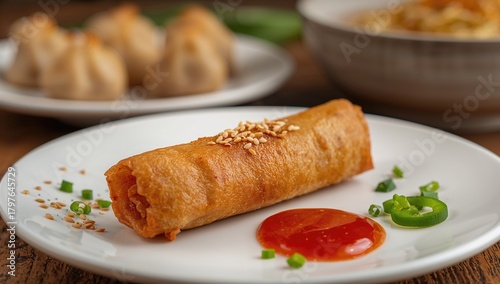 Spring roll served with chili sauce and sprinkled with sesame seeds, culinary delight