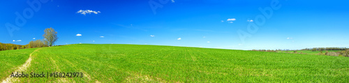 spring rural landscape with field and blue sky, a panorama