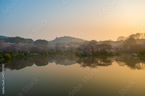Spring scenery of East Lake Cherry Blossom Garden in Wuhan, Hubei, China