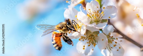 Spring season awakening concept. A bee pollinating a white flower under bright blue skies.
