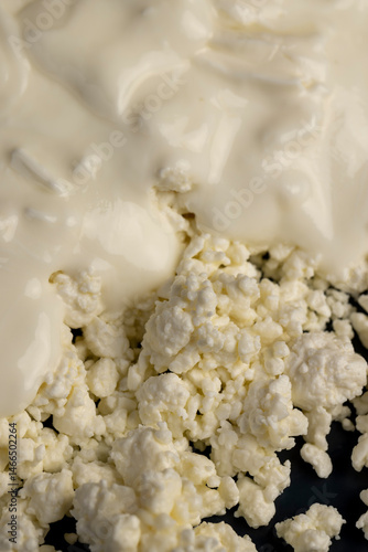 sprinkled with liquid sour cream, lumps of freshly made fermented milk product, side view