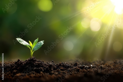 sprout of the young plant grows in rich soil, against a green background with sun rays