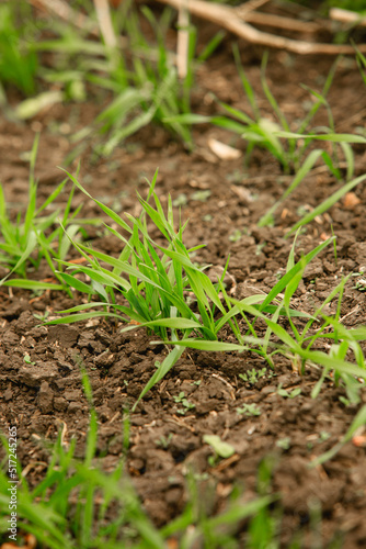 Sprouting of winter crops in the agricultural field in late fall. The technology of cultivation of cereal crops Plant sprouts close-up sharpness in the center.