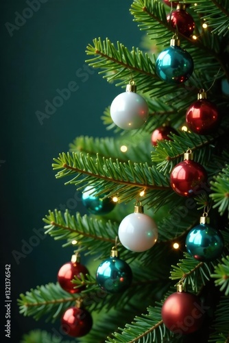 Spruce branch adorned with white and multicolored glass balls, spruce branch, decorative branches