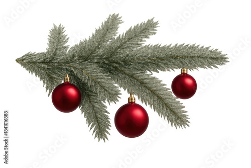 Spruce tree branch with frosted needles and red christmas ornaments, symbolizing holiday season and winter celebration