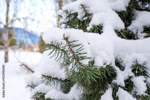 Spruce with needles covered with snow
