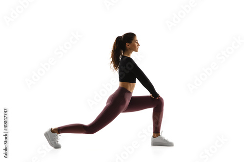 Squats. Young caucasian female model in action, motion isolated on white background with copyspace. Concept of sport, movement, energy and dynamic, healthy lifestyle. Training, practicing.