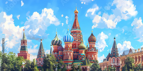 red square, moscow, russia, church, cathedral, architecture, landmark, tourist destination, travel, illustration, blue skies, white cloud, summer, sunny day, colourful, ornate, historic, religious, iconic, city landscape, art, painting, digital artwork, watercolor, landscape, tourist attraction, beautiful, amazing, stunning, fantastic, marvellously, breathtaking, magnificent, impressive, gorgeous, exquisite, elegant, refined, grand, majestic, luxurious, sophisticated
