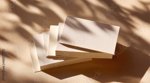 Stack of blank beige cards, dappled sunlight shadows