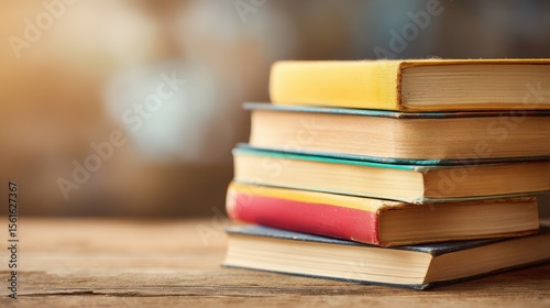 Stack of colorful hardcover books on wooden surface with blurred background scene.