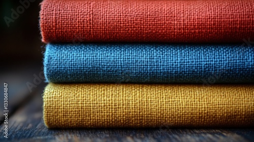 Stack of colorful linen fabrics on wooden surface. Possible use textile display