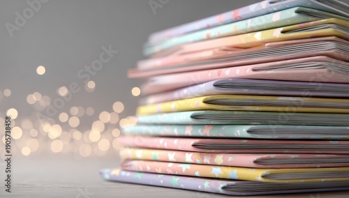 Stack of colorful notebooks with bokeh background and soft light.