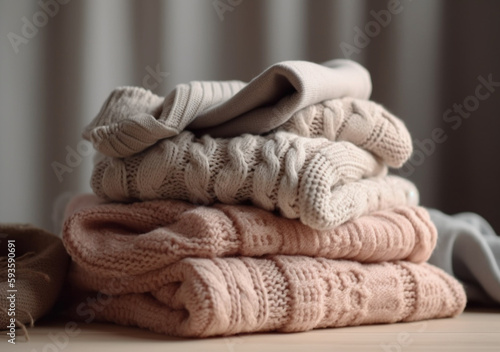 Stack of cotton and knitted colorful clothes on the table. Stacked and folded clean clothing. Generative AI.