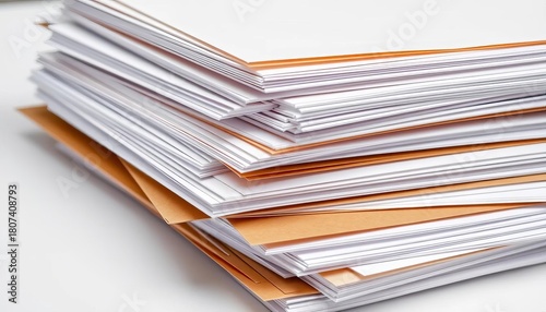 Stack of crisp white papers and brown envelopes ready for mailing, texture, communication