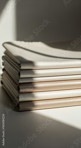 fabric, textile, stack, folded, beige, brown, neutral, texture, material, clothes, linen, cotton, sunlight, shadow, stripes, horizontal, pattern, light, domestic, home, interior, design, still life, nobody, abstract, background, warm, soft, natural, comfort, cosy, layer, minimalist, aesthetic, arrangement, smooth, surface, quality, luxury, blanket, sheet, clothing, fashion