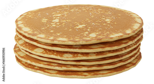 Stack of golden pancakes isolated on white background on a white plate set against a cozy kitchen background
