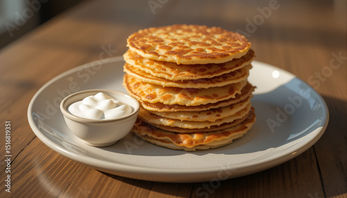 Stack of golden pancakes served with a side of creamy yogurt on a rustic wooden table