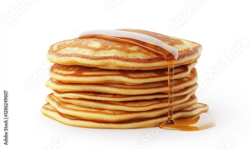Stack of golden pancakes with syrup on white for breakfast menu