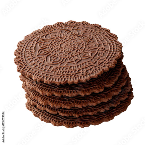 Stack of intricately designed chocolate wafers.