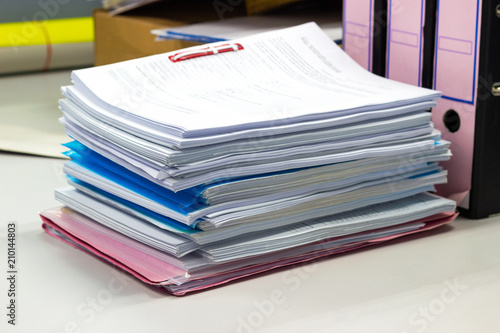 stack of papers documents on file cabinet in Office at offices, business concept.