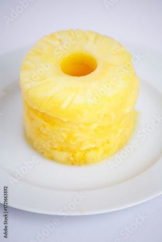 Stack of pineapple rings on a white plate