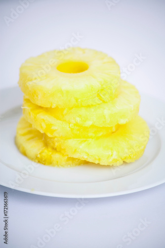 Stack of pineapple slices on a white plate