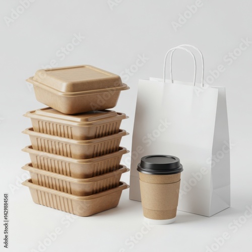 take-out, container, stack, hot drink, cup, bag, white, surface, food, cardboard box, disposable, paper, brown, black, lid, handle, eatery, delivery, meal, lunch, dinner, order, reusing, eco, friendly, minimalist, still, life, studio, shot, plain, background, take-away, beverage, drink, box, carry, out, product
