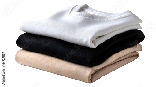 Stack of three folded T-shirts (white, black, beige), cotton fabric, top-down view, isolated on white background