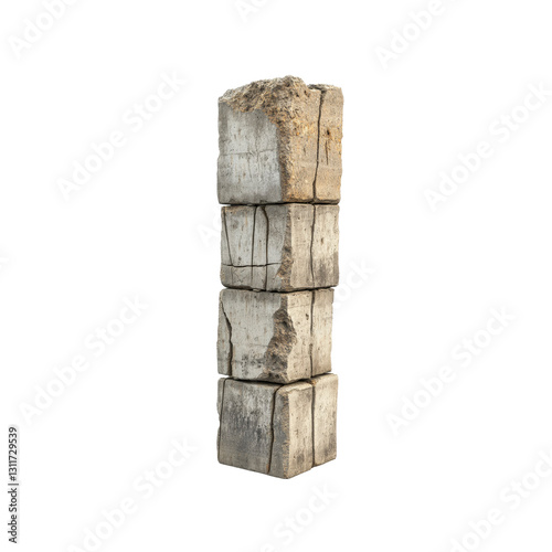 concrete, block, cube, stacked, weathered, aged, old, grunge, texture, rough, cracked, broken, damaged, ruin, debris, construction, demolition, industrial, material, background, design element, isolated, white background, stone, rock, building material, architectural element, fragment, pillar, column, vertical, structure, solid, heavy, grey, beige, earth-tone, abstract, pattern, wall
