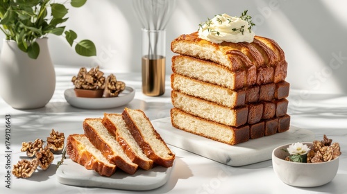 Stacked Brioche Bread Slices Topped with Cream Cheese and Thyme, Served with Walnuts on a Marble Board, Elegant Breakfast or Dessert