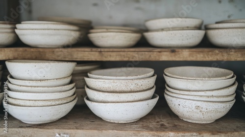 pottery, ceramic, bowl, hand-made, craft, workshop, studio, shelf, wood, stack, white, grey, speckled, rustic, texture, earthenware, stoneware, artisan, kitchen utensile, tableware, design, collection, display, storage, art, object, good, product, interior, detail, closeup, background, surface, grain, minimalist, simple, elegant, aesthetic, clean, vintage, old, traditional, country, rural
