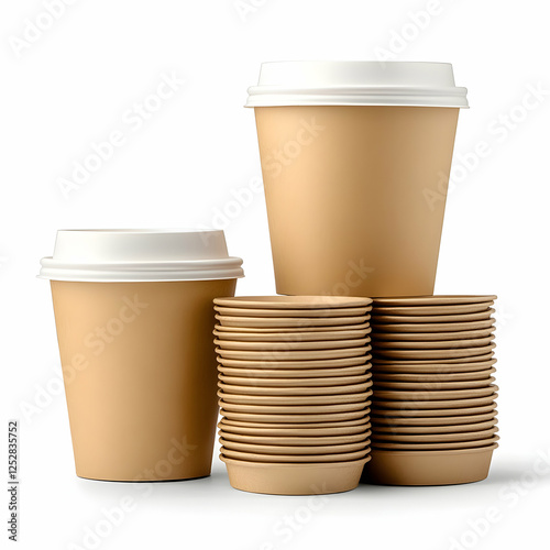 Stacked disposable coffee cups and lids, white background, drink packaging