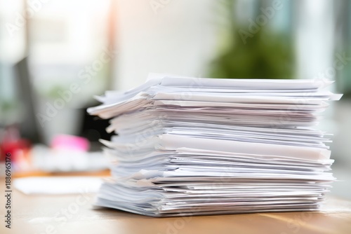 Stacked Documents on Table in Bright Office Environment with Natural Light