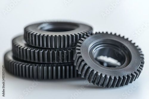 gear, stacked, table, angled, macro, shot, diffused, shadow, plain, white, texture, detail, machinery, industry, design, engineering, part, object, closeup, arrangement, perspective, sharpened, workshop, technology, alignment, circular, equipment, craftsmanship, minimalism, background, simple, clean, round, black, glossy, surface, depth, contrast, visual, composition, aesthetic, symmetry, art, mechanical, precision