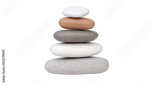 Stacked pebbles in neutral tones, elegant arrangement showcasing simplicity, evokes tranquility and balance, perfect for wellness themes. Isolated on white background or PNG
