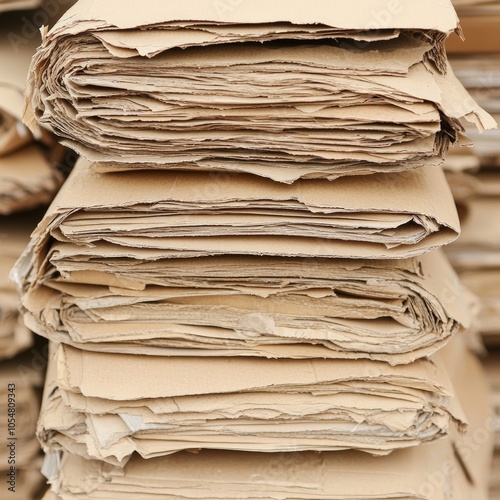 Stacked piles of crumpled cardboard sheets for recycling or storage.