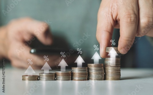 Stacking Coins with Growth Arrows Representing Financial Growth and Percentages