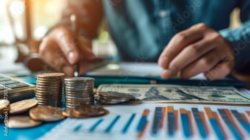 coin, stack, finance, calculation, document, money, budgeting, business, financial, person, accounting, economy, closeup, cash, currency, investment, wealth, income, planning, saving