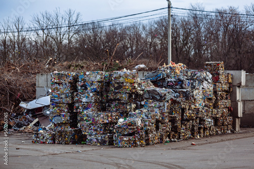 Stacks of garbage. Pressed and packed aluminum and iron cans
