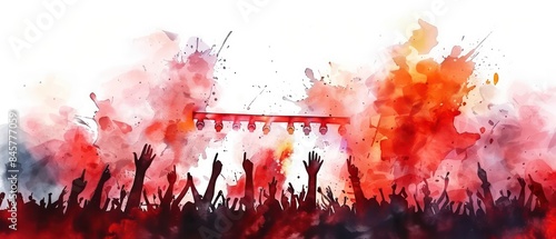 stadium, rock, music, concert, outside, fan, standing, stage, hands up, hand-drawn, watercolor, white background, live music, performance, event, crowd, audience, excitement, energy, atmosphere, celebration, entertainment, festival, vibrant, artistic, illustration