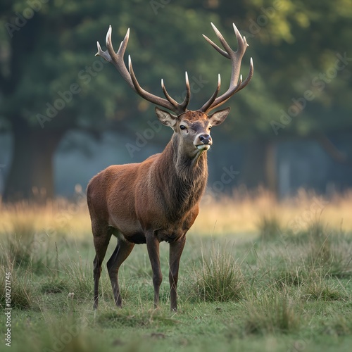 stag, racked, majestic, natural, peaceful, wildlife, meadow, grass, tree, forest, field, antler, fur, eye, leg, neck, back, side, chest, brown, green, beige, mammal, animal, nature, sunlight, morning, serene, portrait, scene, herbivore, fauna, wild, pose, image, photo, background, element, detail, landscape, timberland, conservation, decoration, illustration, wallpaper