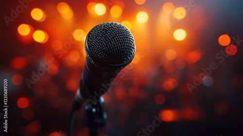microphone, stage, concert, music, performance, light, event, live, audience, sound, audio, spotlight, entertainment, show, bokeh, night, crowd, vocal, singer, speaker, nightlife, public, dark, orange, lighting, blurred, sharpened, detail, closeup, professional, band, acoustic, musician, instrument