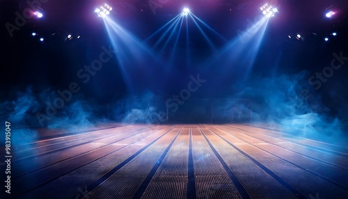 stage, spotlight, light, blue, smoke, dark, night, background, concert, performance, show, event, entertainment, music, theatrical, dramatic, moody, atmospheric, abstract, design, texture, pattern, wooden, floor, beam, ray, glow, bright, dim, shadow, contrast, depth, perspective, empty, blank, space, setting, scene