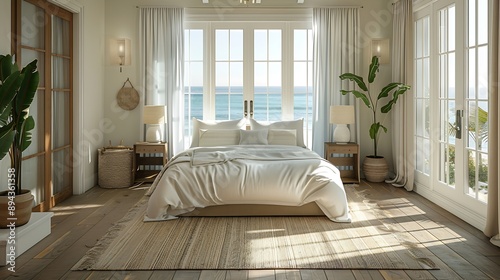 Staged bedroom interior with wooden floors bright spacious rooms with decor clean crisp linens bedding throw pillows hardwood floors and ocean view : Generative AI