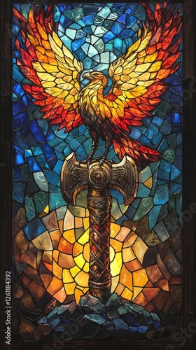 Stained glass art featuring a phoenix perched on a decorated axe, wings ablaze in fiery hues against a mosaic of blue.